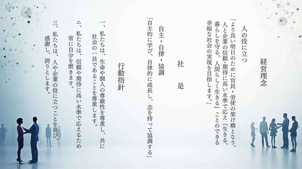 私どもの業務の中心は、社会保険労務士、行政書士の業務であり、中小零細企業の官庁手続、許認可申請や助成金、人事労務、そして労働紛争の早期解決と予防です。最近の傾向として雇用情勢の悪化やインターネットの普及により労働者の権利意識の高まりもあり、労働紛争が増える傾向にあります。特に解雇、退職をきっかけに残業問題や不当解雇等の問題が多く出てきているようで、企業からだけでなく労働者個人からの相談も来ることがあります。今後の重点方針としては、①官庁と企業のパイプ役として、迅速正確な手続代行。②労使のパイプ役として、労働紛争などが起こらないような職場体制づくりはもとより、労使がパートナーの関係で共に成長し合い、企業の社会的役割、使命を果たせるような職場づくりのお手伝い。③助成金、法改正などの情報を分かり易く提供し企業活動に役立てていただくということです。 厳しい経営環境の中で雇用を守ることは中小企業の一つの大きな社会的使命でもあります。働く職場が生活を守る場であり、社会貢献をする場であり、そして人間成長の場となるように企業を強固な砦としていくお手伝いができれば、それが何よりの私共の幸せです。事務所概要